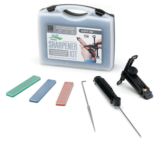 For professional sharpening results, regardless of skill, you can count on DMT® Aligner™ Kits and Accessories. This kit includes three 4" Diamond Whetstones™ for a wide range of sharpening tasks. First among these is a coarse diamond stone (45 micron / 325 mesh) to quickly restore a neglected edge, followed by a fine diamond stone (25 micron / 600 mesh) for honing a razor sharp edge. The kit also includes an extra-fine diamond stone (9 micron / 1200 mesh) to polish and refine a razor edge after sharpening with the coarser stones, as well as a fine diamond serrated knife sharpening accessory. Easy-to-follow instructions are also included. Thanks to the micronized monocrystalline diamond surface on each stone in the kit, you can sharpen edges faster and easier than conventional stones can. No messy oils are needed either, allowing you to sharpen dry or with water. Complete with a 7-Angle adjustable and non-marring blade guide that also accommodates a greater range of blade spine widths, as well as a rugged carry case for portability, the durable construction of it all will provide years of consistent performance and reliable service. For proper tool maintenance, professionals rely on the superior quality and versatility of DMT® products like the Aligner Prokit. Made in the USA.