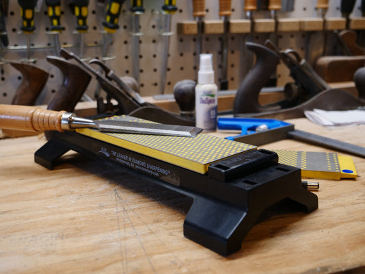 Innovative, multi-patented DuoSharp® Bench Stone is a precision flat, two diamond surfaced sharpener guaranteed to provide consistent, even sharpening every time. The 10" counter or bench sharpener offers larger, wider diamond surface for sharpening a variety of edges including shears, cleaver & specialty knives, plane sole, machete, etc. Fine diamond stone (25 micron / 600 mesh) for a razor sharp edge. Coarse diamond stone (45 micron / 325 mesh) to quickly restore a neglected edge. Sharpening with diamonds is fast and easy. No messy oils needed sharpen dry or with water. Durable construction will provide years of consistent performance and reliable service. For proper tool maintenance, woodworkers, chefs and other professionals rely on the superior quality and versatility of DMT® products. Made in USA.- Precision flat, two-diamond surfaced sharpener guaranteed to provide consistent, even sharpening every time.