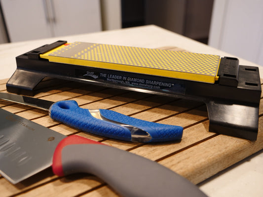The innovative, multi-patented DuoSharp® Bench Stone is a precision flat, two diamond surfaced sharpener guaranteed to provide consistent, even sharpening every time. The 8" counter or bench sharpener offers larger, wider diamond surface for sharpening a variety of edges including shears, cleavers, and specialty knives like plane soles, machetes, and more. This particular model comes equipped with extra-fine diamond (9 micron / 1200 mesh) to polish and refine a razor edge after sharpening with a coarser diamond and coarse diamond (45 micron / 325 mesh) to quickly restore a neglected edge. Thanks to its micronized monocrystalline diamond surface too, you can sharpen edges faster and easier than conventional stones can. No messy oils are needed either, allowing you to sharpen dry or with water. Complete with a durable construction that will provide years of consistent performance and reliable service, professionals rely on the superior quality and versatility of DMT® products. Made in the USA.