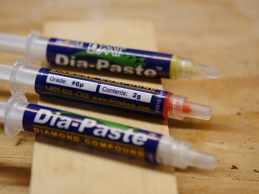 Improve tool performance with DMTs easy-to-use Dia-Paste™ Diamond Compound. A light application will create a highly polished, mirror finish, reducing tool friction for a sharper, stronger edge allowing more use between sharpening. Packaged in convenient 2-gram syringe. Kit of 3: Copper coded (6 micron / 4000 mesh) removes scratches with light pressure polishing action. Yellow coded (3 micron / 8000 mesh) for a glossy bevel edge. Gray coded (1 micron / 15000 mesh) for the ultimate polished mirror bevel edge. Apply oil-based compound to flat surface; using precise angle control, sharpen tool against the compound to achieve desired results. For proper tool maintenance, woodworkers, chefs and other professionals rely on the superior quality and versatility of DMT® products. Made in USA.- Extends working life of tool.