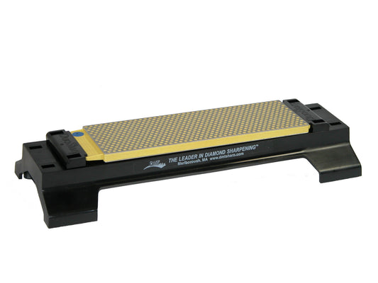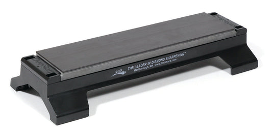 The innovative, multi-patented DuoSharp® Bench Stone is a precision flat, two diamond surfaced sharpener guaranteed to provide consistent, even sharpening every time. Designed with a larger, wider diamond surface for sharpening a variety of edges, this 8" DuoSharp® Bench Stone is an excellent counter and bench sharpener. This model also comes with a Bench Stone Base Accessory, and is equipped with two separate grits. On one side, there is extra-fine diamond (9 micron /1200 mesh) to polish and refine a razor edge after sharpening with a coarser diamond. On the opposite side, there is fine diamond (25 micron / 600 mesh) for initially honing the razor sharp edge. Thanks to the micronized monocrystalline diamond surface on each side as well, you can sharpen edges much faster and easier than conventional stones can. No messy oils are needed either, allowing you to sharpen dry or with water. Complete with a durable construction that will provide years of consistent performance and reliable service, professionals rely on the superior quality and versatility of DMT® products for proper tool maintenance. Made in the USA.