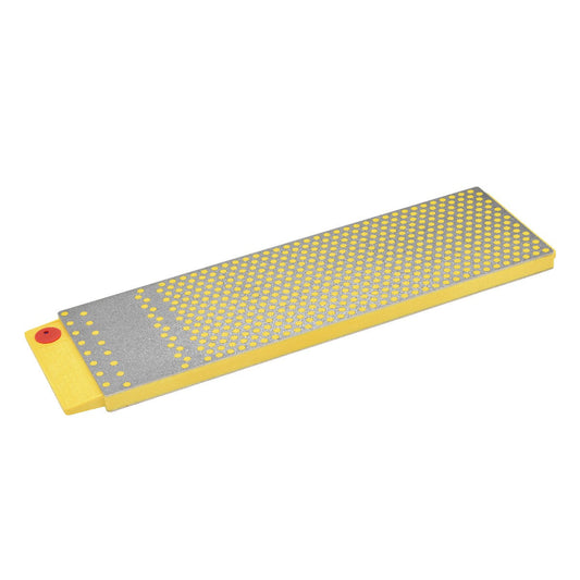 The innovative, multi-patented DuoSharp® Bench Stone is a precision flat, two diamond surfaced sharpener guaranteed to provide consistent, even sharpening every time. The 10" counter or bench sharpener offers larger, wider diamond surface for sharpening a variety of edges including shears, cleavers, and specialty knives like plane soles, machetes, and more. This particular model comes equipped with extra-fine diamond (9 micron / 1200 mesh) to polish and refine a razor edge after sharpening with a coarser diamond, and coarse diamond (45 micron / 325 mesh) to quickly restore a neglected edge. Thanks to its micronized monocrystalline diamond surface as well, you can sharpen edges faster and easier than conventional stones can. No messy oils are needed either, allowing you to sharpen dry or with water. Complete with a durable construction that will provide years of consistent performance and reliable service, professionals rely on the superior quality and versatility of DMT® products. Made in the USA.